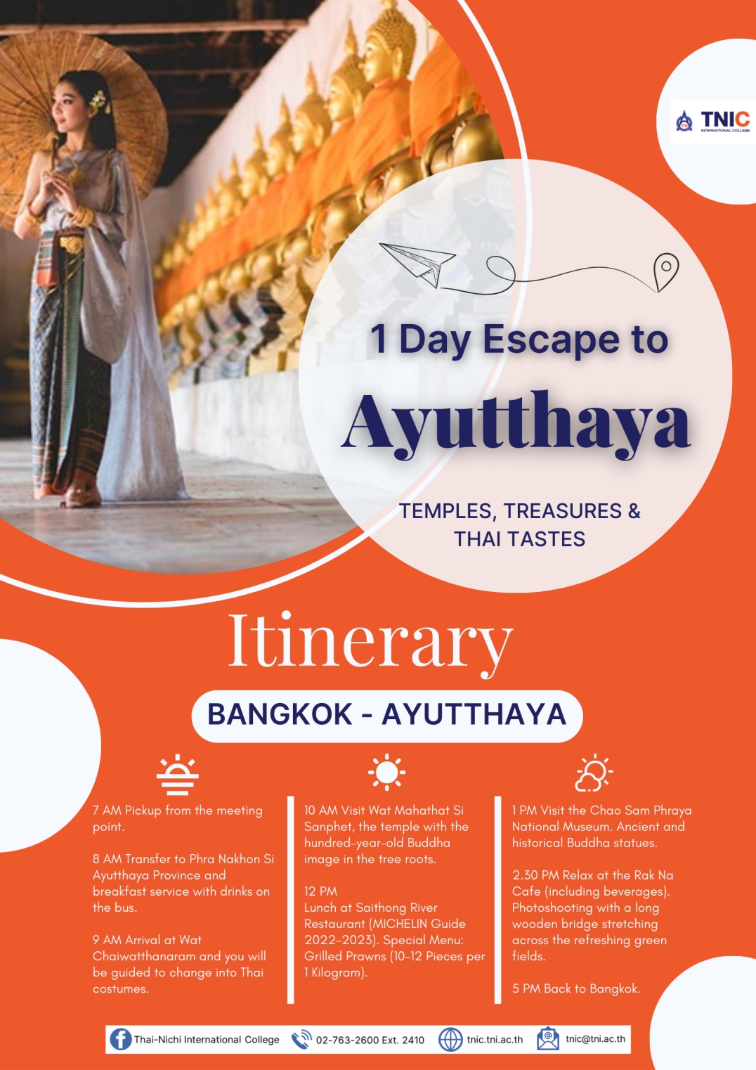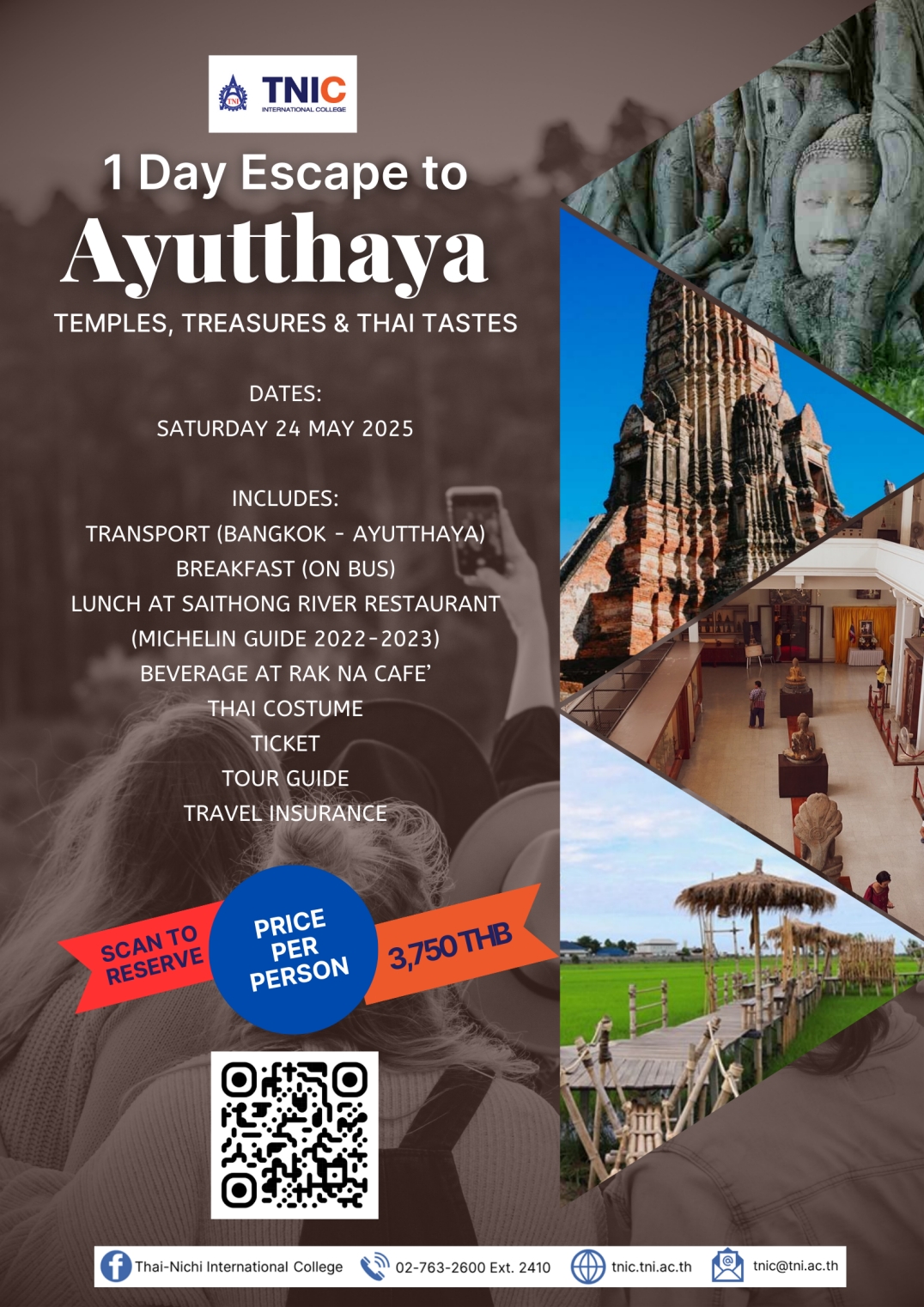 Optional Tour Dinner Cruise with Bangkok’s Illuminated GemsThursday, 22 May 2025 Payments Registration 1 Day Escape to Ayutthaya: Temple, Treasures & Thai TastesSaturday, 24 May 2025 Payments Registration