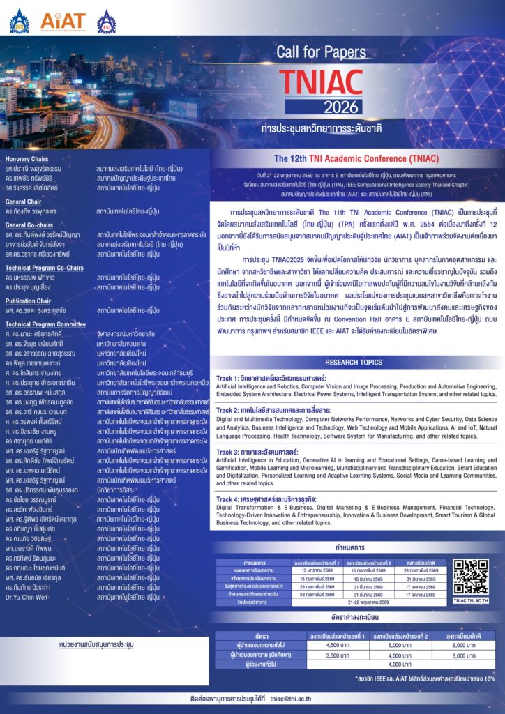 การประชุม TNIAC2026 จัดขึ้นเพื่อเปิดโอกาสให้นักวิจัย นักวิชาการ บุคลากรในภาคอุตสาหกรรม และนักศึกษา จากสหวิชาชีพและสาขาวิชา ได้แลกเปลี่ยนความคิด ประสบการณ์ และความเชี่ยวชาญในปัจจุบัน รวมถึงเทคโนโลยีที่จะเกิดขึ้นในอนาคต นอกจากนี้ ผู้เข้าร่วมจะมีโอกาสพบปะกับผู้ที่มีความสนใจในงานวิจัยที่คล้ายคลึงกัน ซึ่งอาจนำไปสู่ความร่วมมือด้านการวิจัยในอนาคต ผลประโยชน์ของการประชุมแบบสหสาขาวิชาชีพคือการทำงานร่วมกันระหว่างนักวิจัยจากหลากหลายหน่วยงาน ที่จะเป็นจุดเริ่มต้นนำไปสู่การพัฒนาสังคมและเศรษฐกิจของประเทศ การประชุมครั้งนี้ มีกำหนดจัดขึ้น ณ Convention Hall อาคาร E สถาบันเทคโนโลยีไทย-ญี่ปุ่น ถนนพัฒนาการ กรุงเทพฯ สำหรับสมาชิก IEEE และ AIAT จะได้รับค่าลงทะเบียนในอัตราพิเศษ